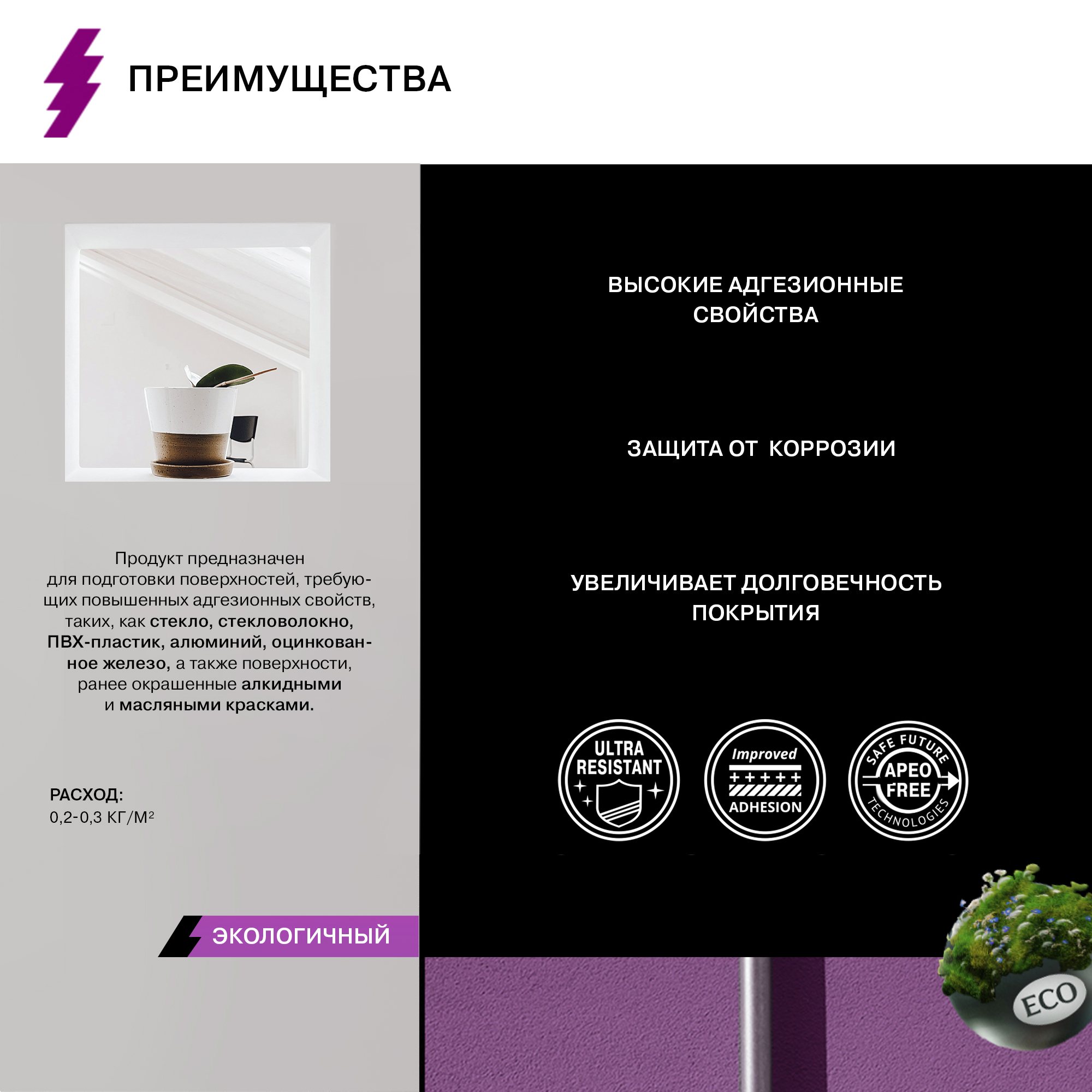 Продукт предназначен для подготовки поверхностей, требующих повышенных адгезионных свойств, таких, как стекло, стекловолокно, ПВХ-пластик, алюминий, оцинкованное железо, а также поверхности, ранее окрашенные алкидными и масляными красками.