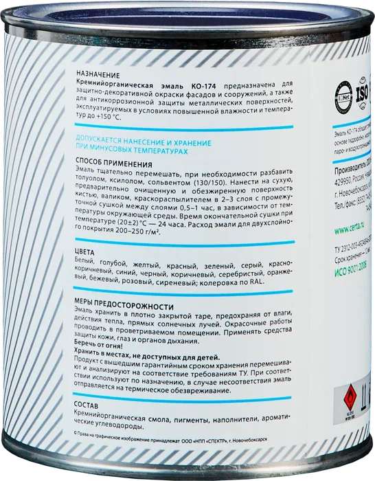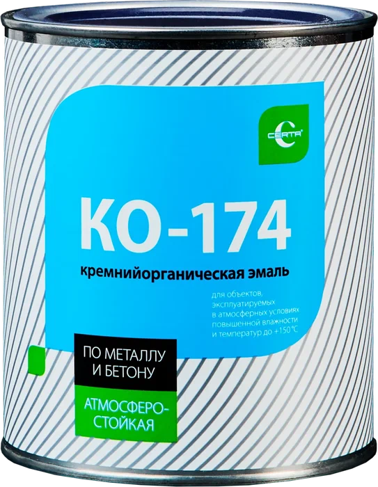 • Cиликоновая (или другими словами кремнийорганическая) основа эмали КО-174 CERTA позволяет ей называться фасадной и использоваться для антикоррозионной защиты металла, бетона, штукатурки, кирпича.