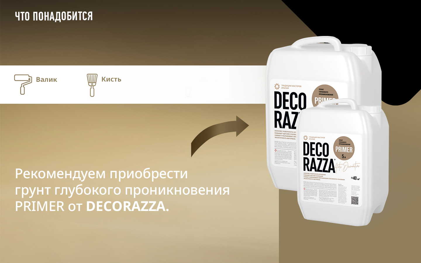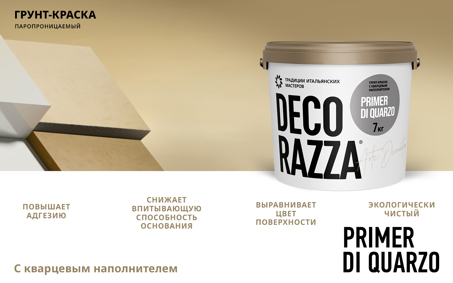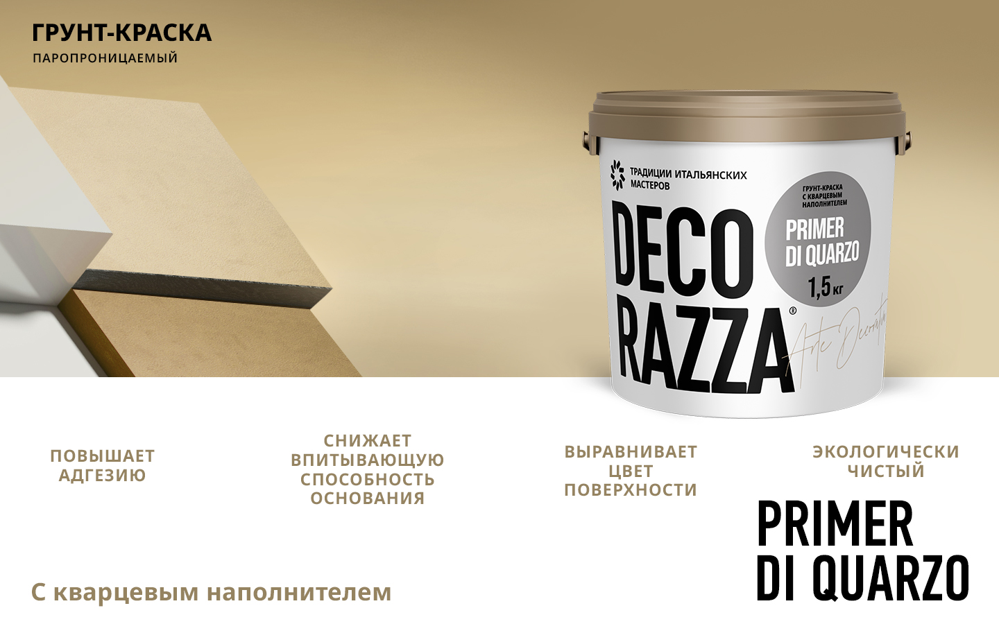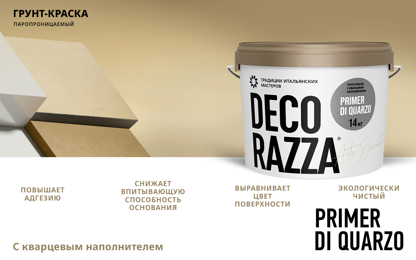 Грунт с кварцем под фактуры PRIMER DI QUARZO - Кварцевый адгезионный грунт Decorazza PRIMER DI QUARZO Decorazza PRIMER DI QUARZO — это высококачественный акриловый грунт, специально разработанный для применения в декоративной отделке помещений. Его основу составляет кварцевое наполнение, что обеспечивает исключительное качество и долговечность покрытия. Благодаря своим адгезионным свойствам, этот грунт значительно улучшает сцепление декоративной штукатурки с поверхностью, обеспечивая безупречное покрытие без пузырьков и трещин. Этот продукт обладает приятным преимуществом — он абсолютно без запаха, что делает его идеальным выбором для использования в жилых и офисных помещениях. Decorazza PRIMER DI QUARZO идеально подходит как для новых, так и для уже существующих поверхностей, позволяя применять разнообразные декоративные покрытия и текстурированные штукатурки. С его помощью вы сможете добиться ровной основы и создать эффектные, долгопротекающие декоративные решения, которые будут радовать глаз долгие годы. от бренда Decorazza с доставкой по России!
