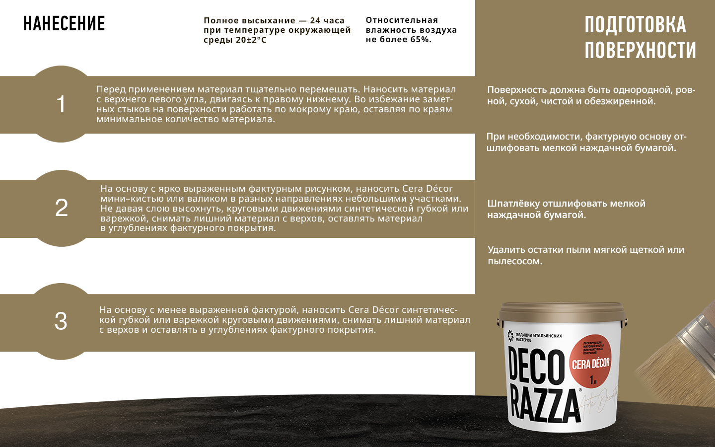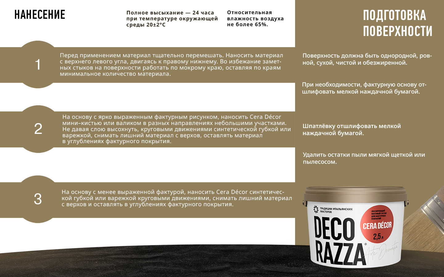 При температуре окружающей среды + 22°С и относительной влажности не более 65 %: Лессирующий состав Cera Décor: полное высыхание через 24 часа, влажная уборка не ранее, чем через 28 дней. Время высыхания материалов может меняться в зависимости от температуры и влажности окружающей среды. |