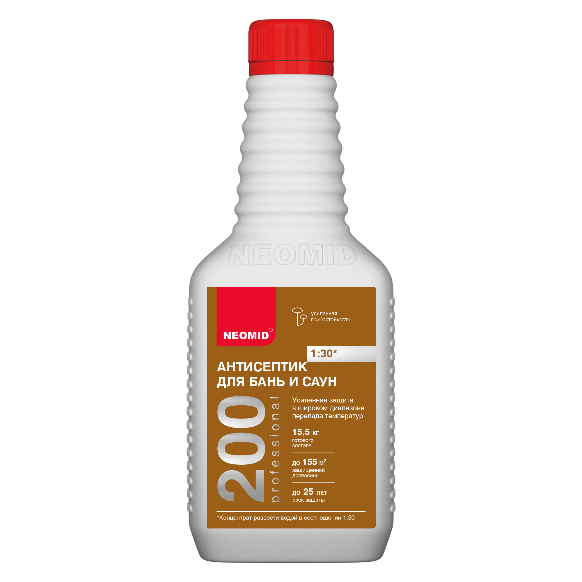 Неомид 200 1:30 и Неомид 200 1:5 – новое высокоэффективное средство для усиленной защиты древесины внутри бань и саун, включая полки и скамейки. Обеспечивает сверхвысокую защиту древесины от гниения, дереворазрушающих и деревоокрашивающих плесневых грибов, в условиях частого перепада температур и повышенной влажности на срок до 25 лет.